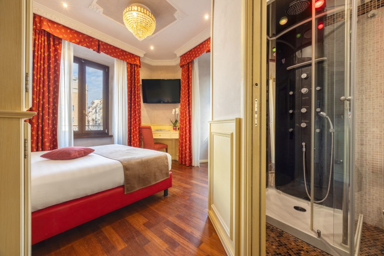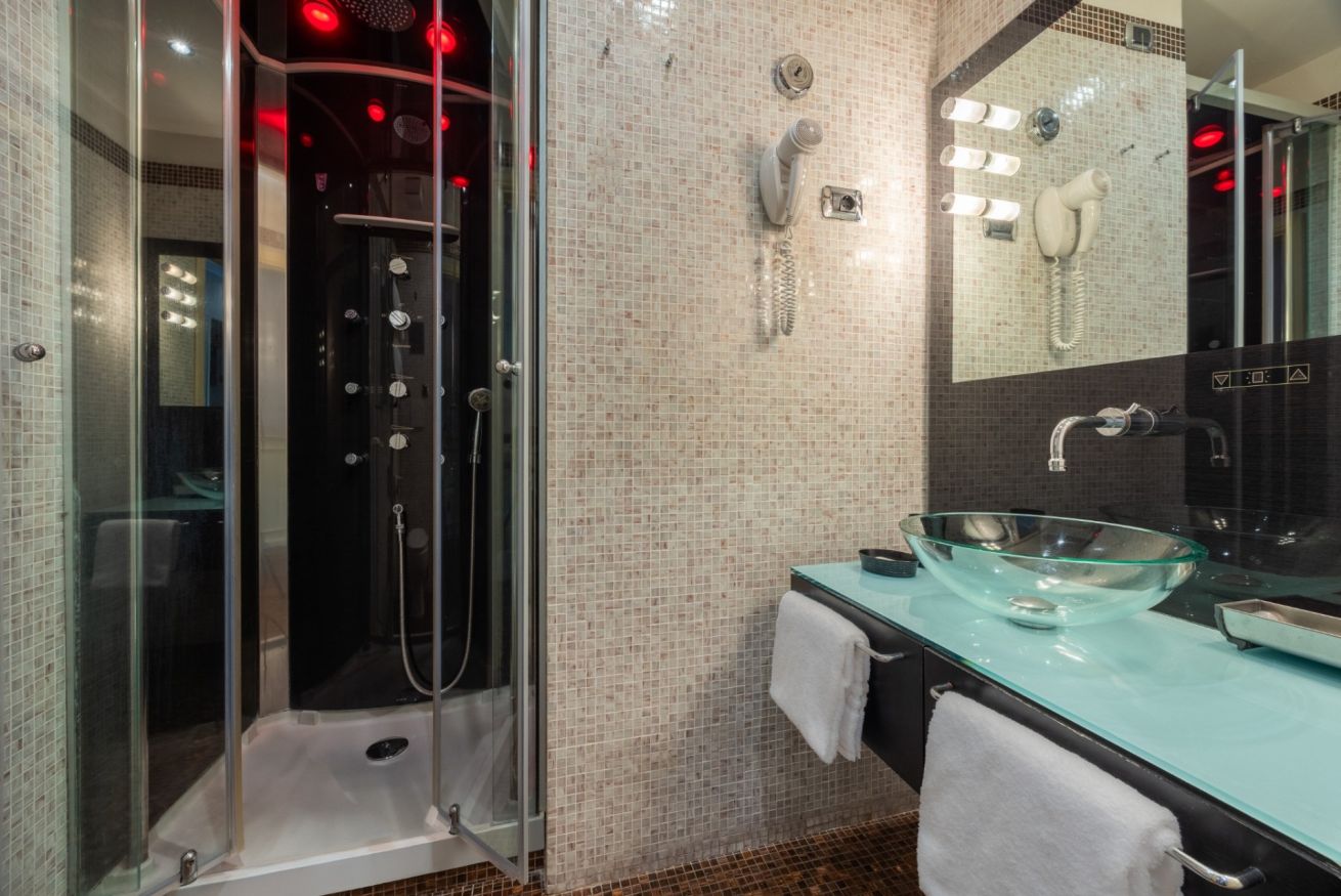 Questa camera misura 15 metri quadrati. Grazie a materassi memory foam, biancheria firmata e piumino ti aspettano notti di vero riposo! Il bagno privato è dotato di doccia emozionale, cromoterapia e massaggio, nonché di set di cortesia e TV. Grazie all'accesso wireless ad Internet ultra veloce gratuito resterai connesso con il mondo, mentre per l'intrattenimento avrai a disposizione Smart TV da 42 pollici Full HD. Per rendere il soggiorno ancora più piacevole, la camera include accessori per caffè/tè e frigorifero. La sistemazione include aria condizionata, cassaforte .